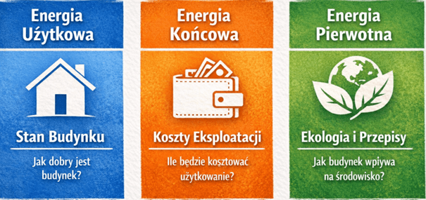 oraz najważniejsze wskaźniki energetyczne, czyli energię użytkową, końcową i pierwotną.